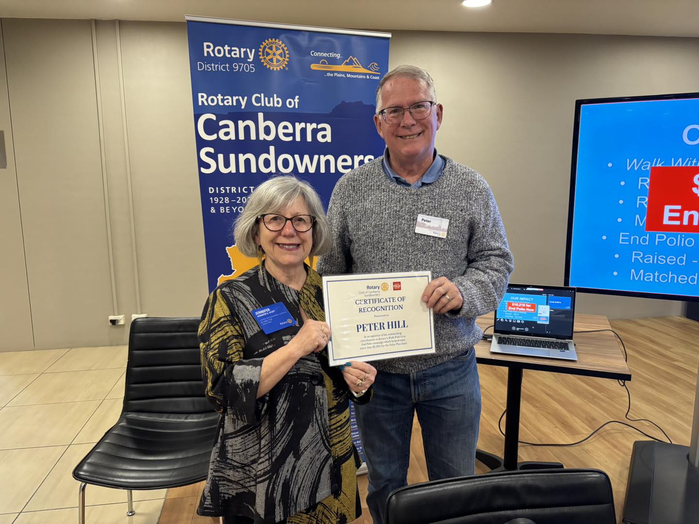 Some of our members took part in the Walk With Us to End Polio challenge, pounding the pavement in their red End Polio Now apparel right across the ACT. Together they clocked up 1,453 kilometres and raised $2,593. With the Gates Foundation's 2:1 match, that’s $7,779 going directly to PolioPlus! We also hosted a World’s Greatest Meal fundraiser, which raised $813 and once matched, that’s another $2,440 towards PolioPlus. All up, we have played a part in contributing $10,219, helping drive awareness and support for Rotary’s global mission to end polio for good. At our meeting this week, Rotary International Director Jennifer Scott AM presented a Certificate of Appreciation to Peter Hill for his huge efforts in the Walk With Us challenge. Unfortunately, the rest of our walking and running crew couldn’t make it as they’re still icing their calves after such a big month of steps! Our sincere thanks to everyone who walked, donated or cheered us on. Together, we’re one step closer to a polio-free world. |